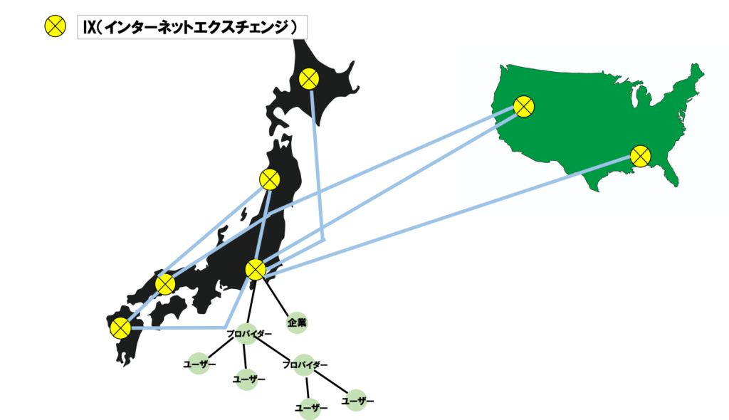 IXは、「東京」「大阪」「名古屋」などの主要都市にあります。IX同士は互いに接続されています。これらの接続点は海外にも接続されています。